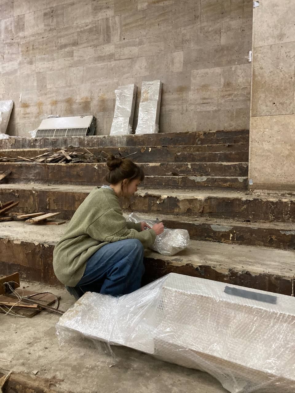 Снять со стен и погрузить в транспорт горельефы помогли рабочие. Транспорт предоставило руководство управления культуры города и концертного зала.