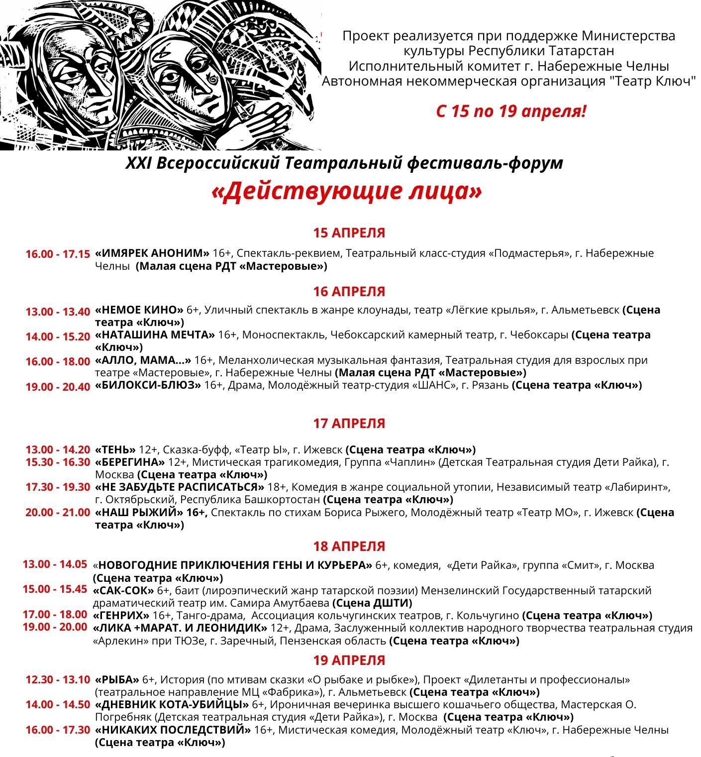 В этом году фестиваль объединит 16 театров и представит 20 спектаклей из разных регионов России. В автоград приедут участники из Москвы, Рязани, Ижевска, Чебоксар, Альметьевска, Нижнекамска и других городов. По словам директора и художественного руководителя театра «Ключ» Софьи Дивногорской, фестиваль продолжает развиваться не только как сценическая площадка, но и как образовательная платформа.