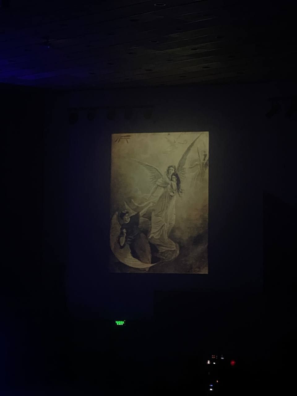 Особую атмосферу спектаклю придал видеоряд, составленный из знаковых полотен, иллюстрирующих сюжет и настроение поэмы. На экране сменяли друг друга работы Михаила Врубеля («Суд Париса», «Демон у ворот монастыря», «Демон и ангел с душой Тамары»), пейзажи самого Лермонтова («Вид Крестовой горы из ущелья близ Коби», «Черкес с лошадью») и картина Виталия Ермолаева «Внутренний свет».