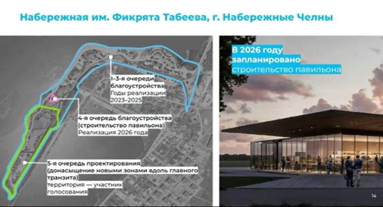 «В этом году на территории набережной появится большой павильон, который будет служить точкой предстоящего 400-летнего юбилея города (помечен на снимке розовым - прим. ред). Уже реализованы на набережной детская зона, крупная событийная зона. В 2027 году, если жители Челнов набережную выберут в голосовании, мы завершим ее благоустройство», - отметила директор фонда.