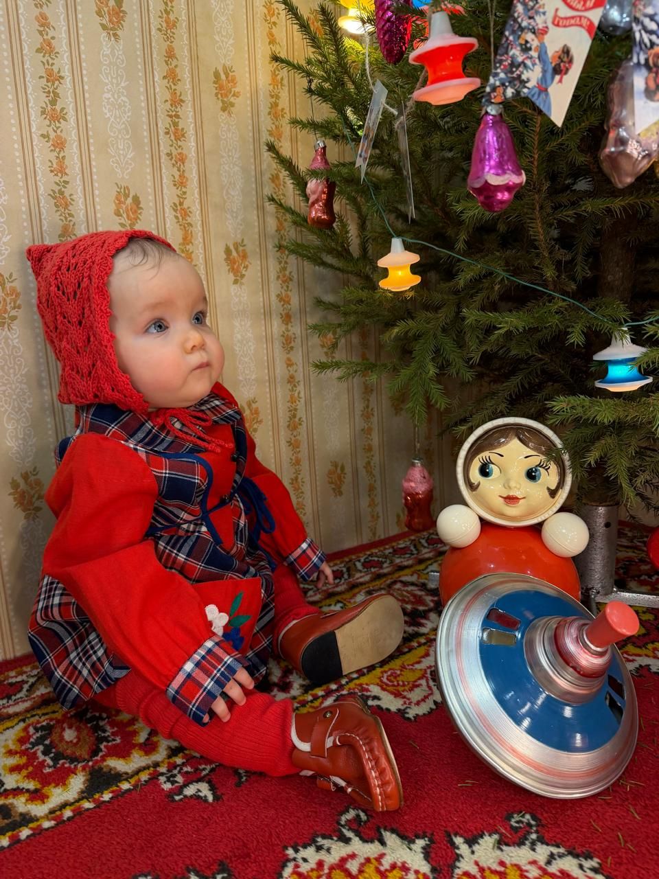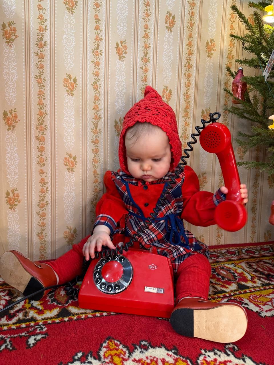 Так в квартире возник особый уголок для ретро-съемок. Тумбочку, ковер челнинка одолжила у родителей, телефон, часы - подарок знакомых. Живую ель украсили старинные елочные игрушки из домашней коллекции.