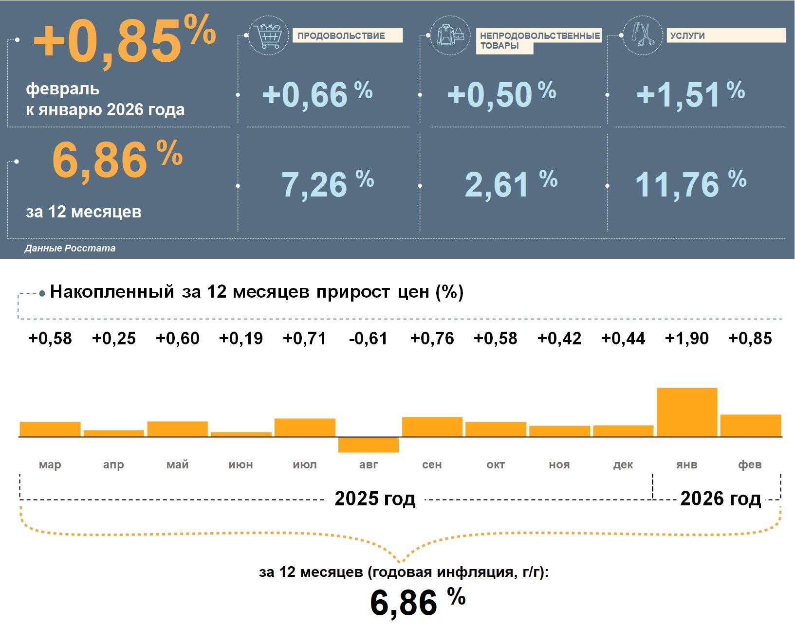 Согласно статистическим данным, опубликованным Росстатом, в феврале 2026 года потребительские цены в Татарстане увеличились на 0,85% по сравнению с предыдущим месяцем. При этом показатель годовой инфляции в регионе составил 6,86%, что оказалось выше средних значений как по Приволжскому федеральному округу (6,53%), так и по России в целом (5,91%).