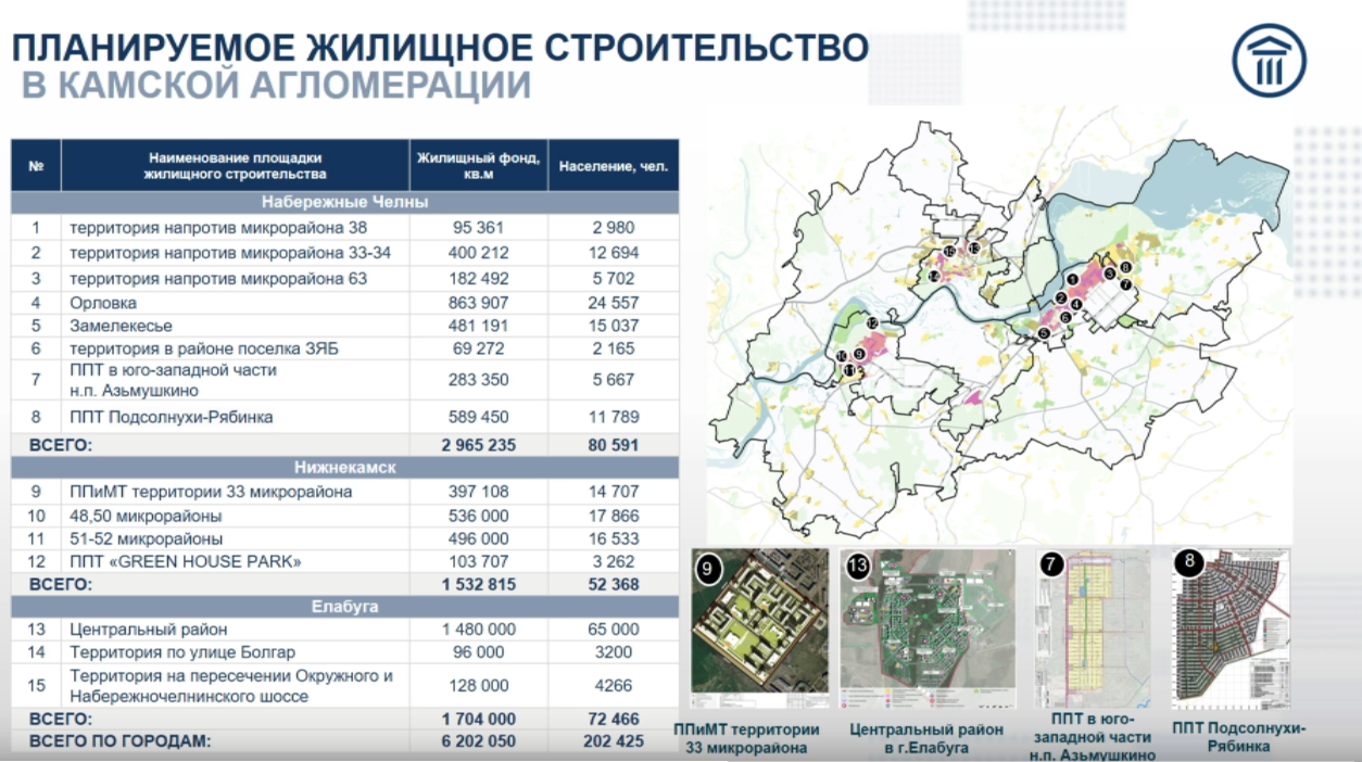 «В Камской агломерации выделены 15 приоритетных площадок с суммарным объемом жилищного фонда более 6 миллионов квадратных метров, что позволяет обеспечить к 2050 году жильем дополнительно 200 тысяч человек. Наиболее масштабные проекты реализуются в Набережных Челнах – это микрорайон Орловка и Замелекесье», – уточнил Марат Айзатуллин.
