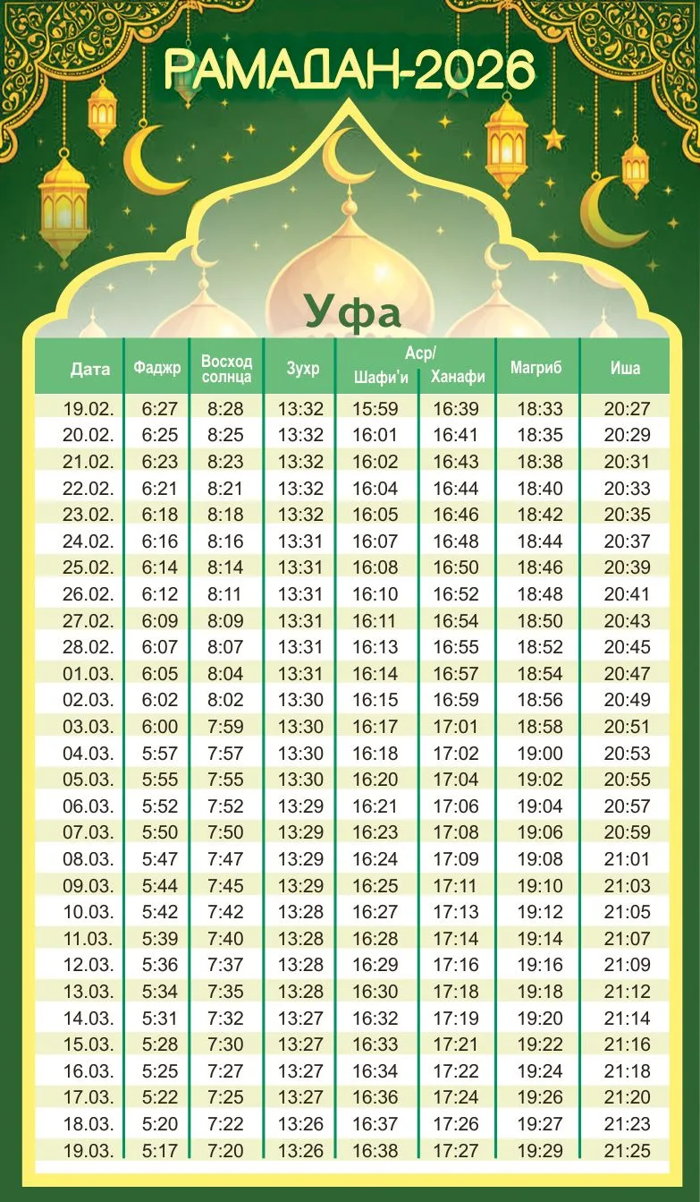 Публикуем таблицы с указанием времени намазов для Набережных Челнов, Казани, Альметьевска, Уфы и Москвы.