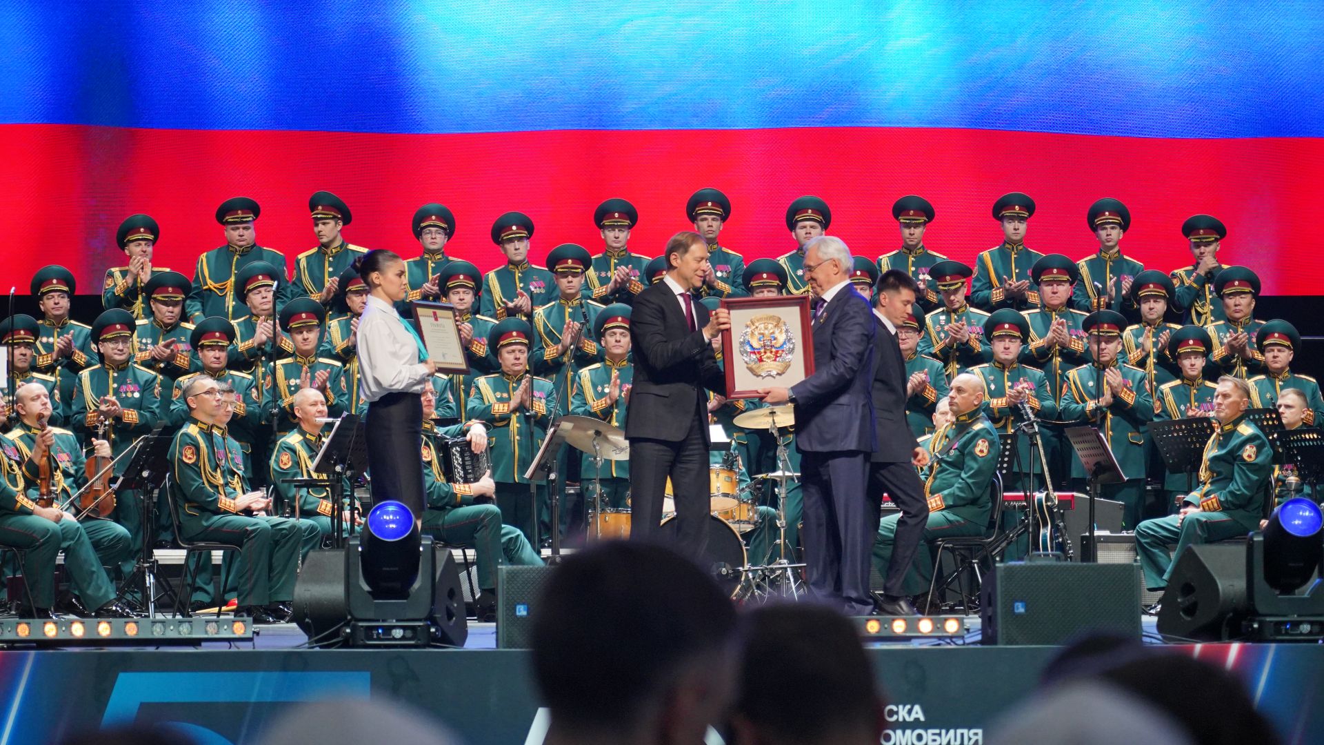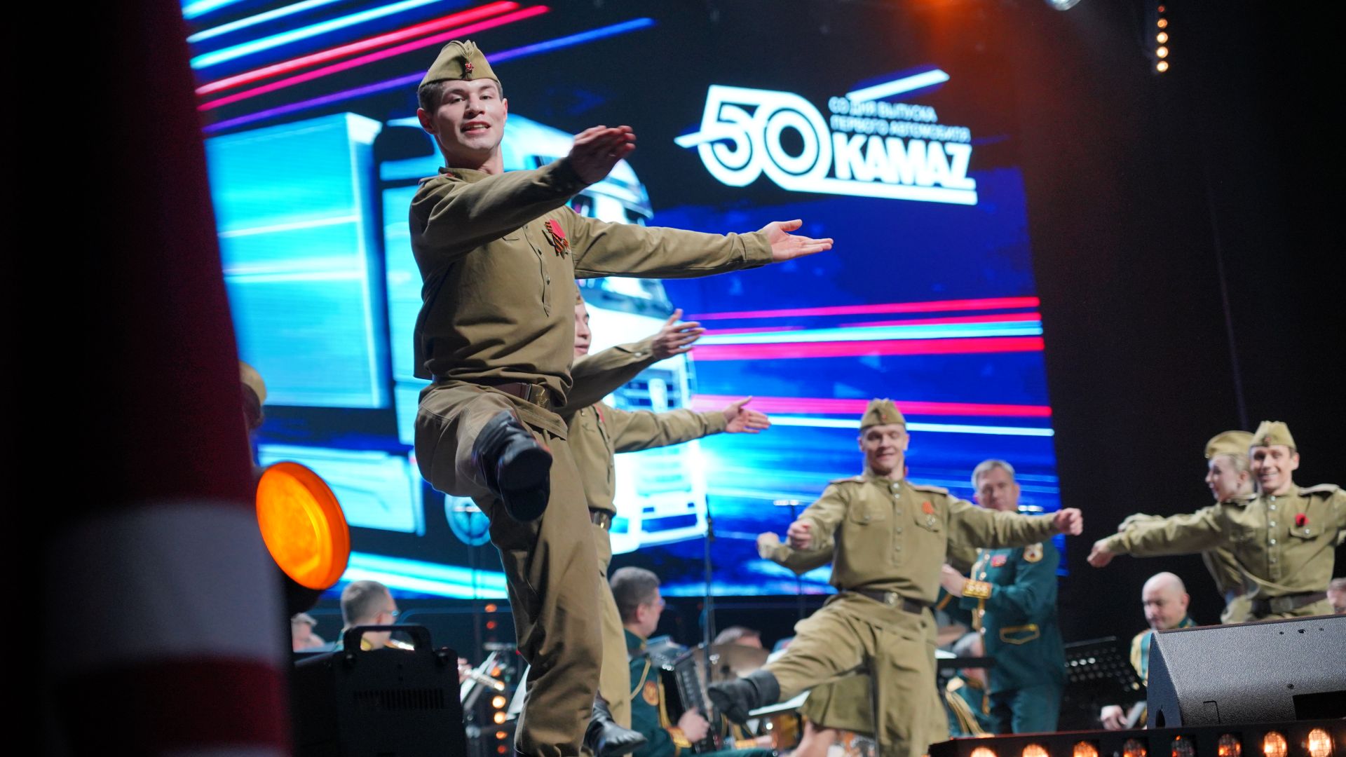 После официальной части гостей и виновников торжества ожидал подарок – прямо из Москвы, чтобы поздравить челнинцев, прибыл Академический ансамбль песни и пляски войск национальной гвардии Российской Федерации. Со сцены звучало то, что близко каждому, кто хоть раз стоял у станка или выходил на утреннюю смену: высокие ноты вплетались в мелодию «Коня» группы «Любэ», а когда зазвучали знакомые аккорды «Мин яратам сине, Татарстан», зал превратился в единый хор.