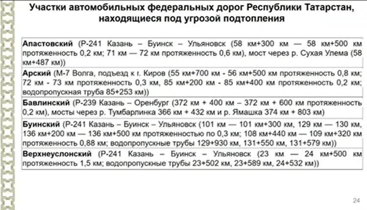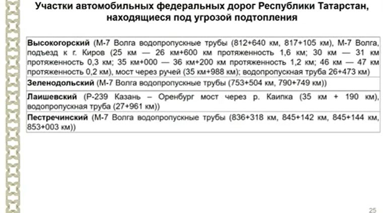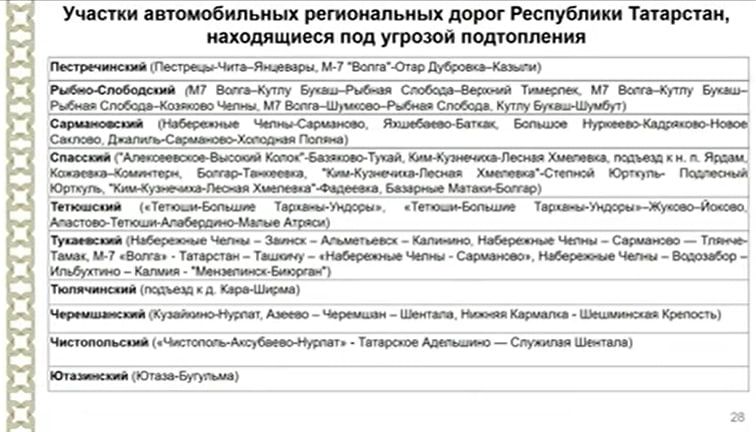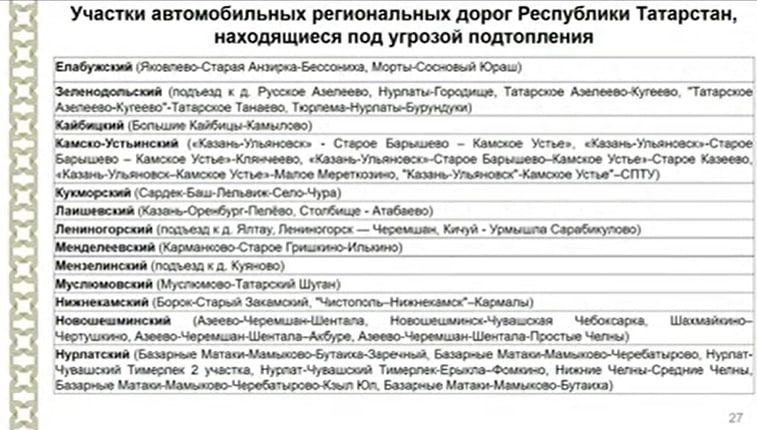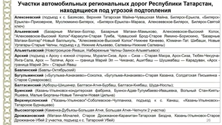 Обратить особое внимание на прогнозируемые участки дорог под угрозой подтопления попросил замминистра по делам гражданской обороны и чрезвычайным ситуациям Татарстана Николай Суржко. Это 37 участков на дорогах федерального значения в девяти районах и 155 участков региональных дорог в 34 районах.