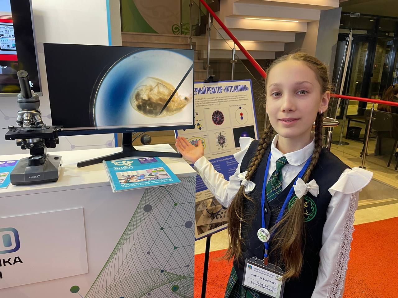 Ученица 5 класса лицея №84 Ясмина Закирова на татарском языке рассказала о своем исследовании микромира. Она взяла пробу воду из городского озера, изучила микроорганизмы, химико-биологические свойства, чистоту. Главное открытие — даже в обычной капле озёрной воды кипит невидимая жизнь с рачками и инфузориями, которые очищают воду. Рустам Минниханов заинтересовался и сам заглянул в микроскоп, чтобы увидеть находки.