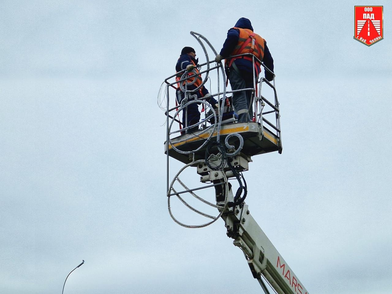 «Сейчас развешиваем шары в цветах флага Татарстана. Есть такие же консоли в цветах российского триколора», – поделился подробностями процесса старший мастер участка наружного освещения ООО «ПАД» Евгений Грищенко.