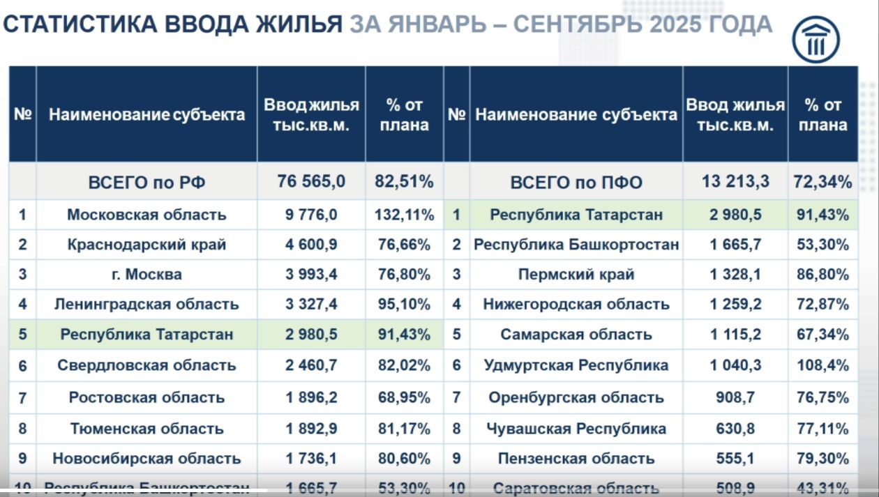 «За январь-сентябрь 2025 года Татарстан занимает первое место в Приволжском Федеральном округе по вводу жилья и пятое место в России. По стране республика с 2,9 миллионами квадратных метров жилья идет вслед за Московской областью – 9,7 миллиона, Краснодарским краем – 4,6 миллиона, Москвой – 3,9 миллиона, Ленинградской областью – 3,3 миллиона», – уточнил министр.