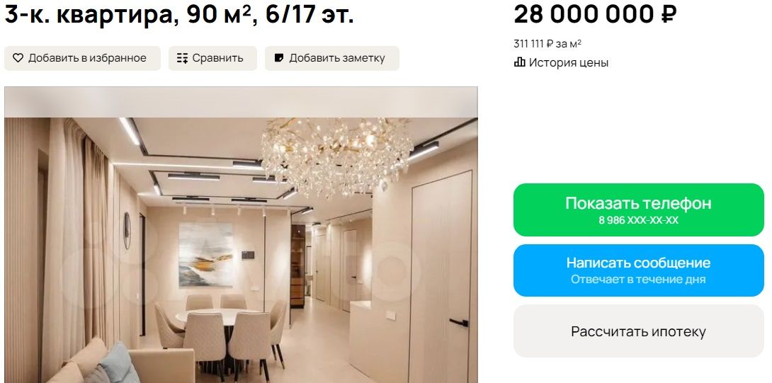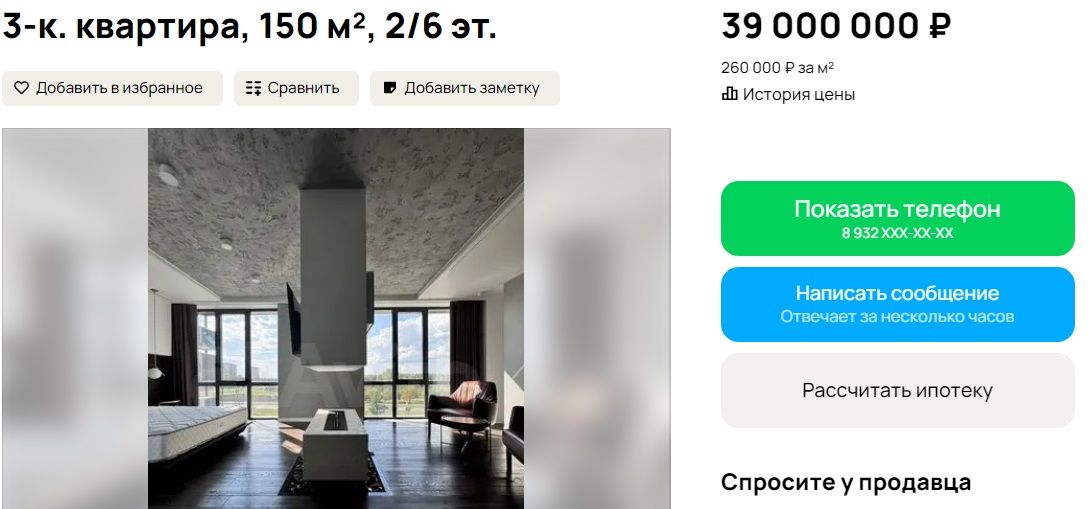 Третьей на очереди квартирой является трехкомнатная недвижимость, находящаяся на втором этаже шестиэтажного клубного дома Plazma. Еще в первые дни сентября жилье обошлось бы ровно в 37 миллионов, однако сейчас цена поднялась и составляет 39 000 000 рублей. За эту сумму предлагается приобрести жилплощадь в 150 кв. м. Квадратура кухни приравнивается к 40 кв. м. Продавец отдельно отмечает «топовую» квартирографию с продуманной эргономикой пространства. Из прочих бытовых удобств отмечается, что каждая спальная комната имеет отдельную гардеробную и санузел.