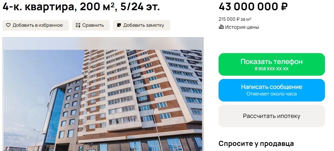 Самая дорогая квартира на данный момент находится на проспекте Сююмбике, насчитывает четыре комнаты и 200 кв. м., за каждый из которых предлагается заплатить в размере 215 000 руб. Общая стоимость приравнивается к 43 миллионам рублей. Отмечается, что цена включает одно место на подземной парковке. Квадратура кухни насчитывает 35 кв. м., зато жилая зона – аж 120. Апартаменты находятся на пятом этаже 24-этажного жилого дома рядом с Sunrise city.