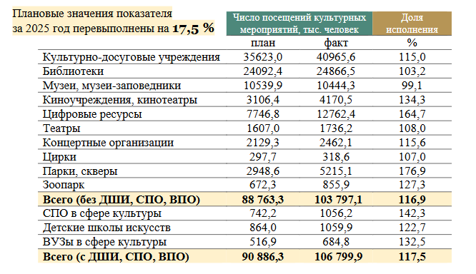 В Татарстане в 2025 году культурные мероприятия посетило 106,7 миллиона человек, что на 17,5 процента выше плана и на 6,2 процента больше, чем в 2024 году. Об этом стало известно на итоговой коллегии министерства культуры республики.