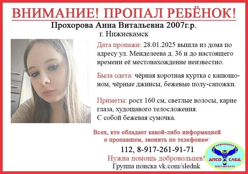 В Нижнекамске почти месяц разыскивают 17-летнюю Анну Прохорову, которая 28 января вышла из дома №36 на улице Менделеева и до сих пор ее местонахождение неизвестно.