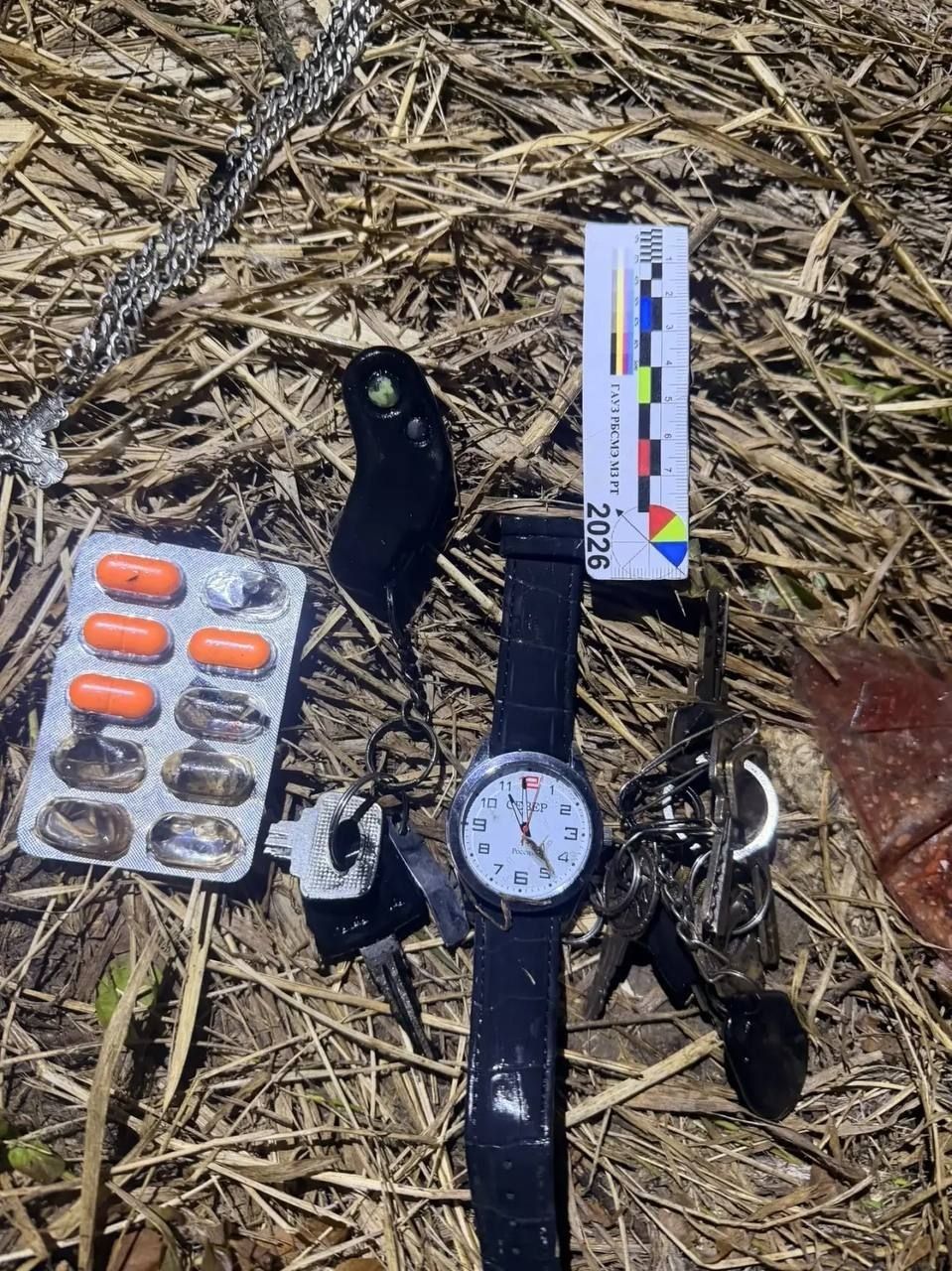 Личные вещи: связка ключей от квартиры, ключ с брелком от авто, наручные часы «Север», серебряный крест на цепочке.