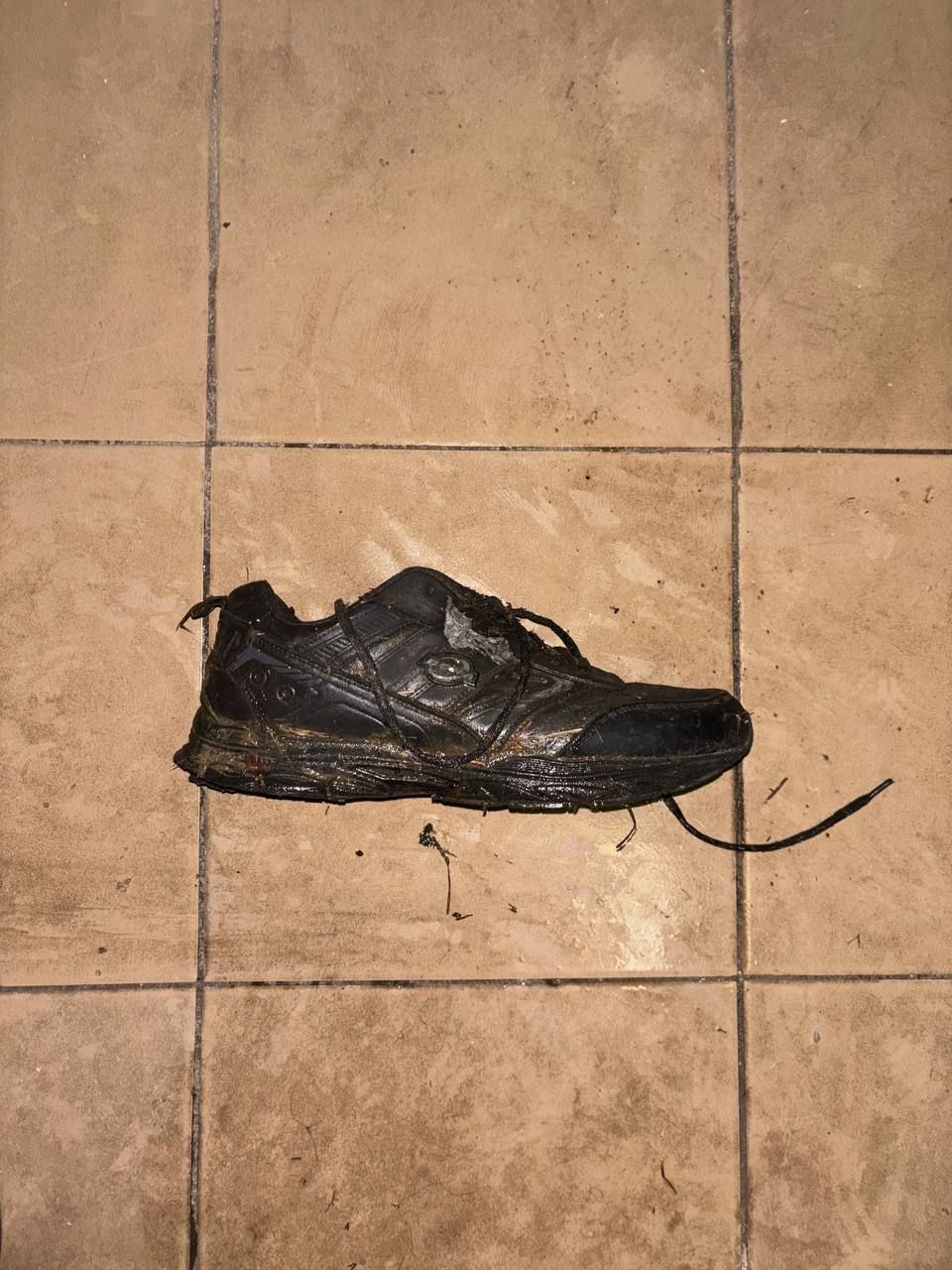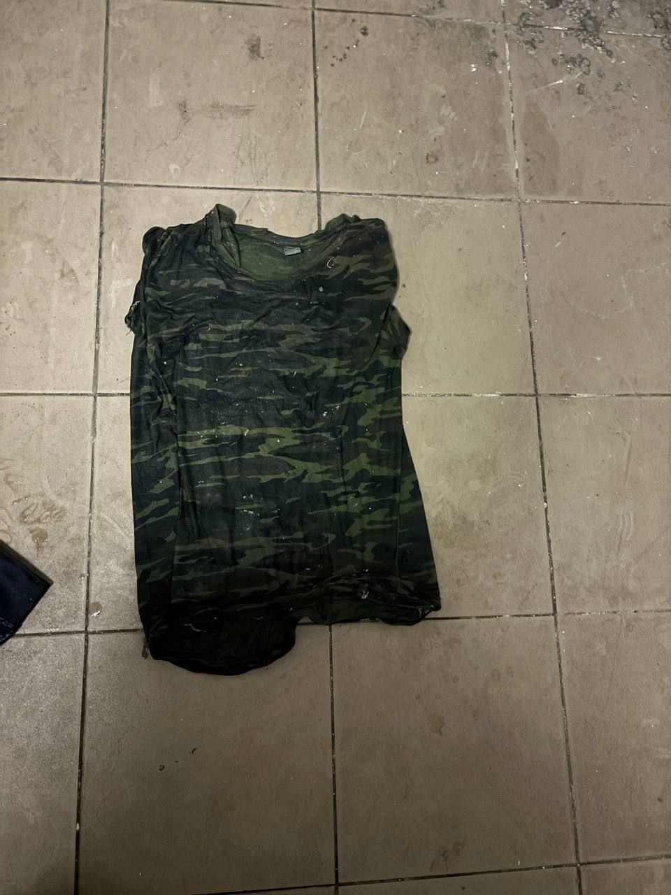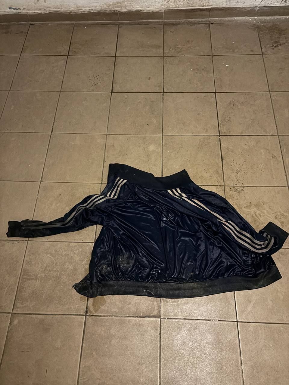 Одежда: черная куртка с белой полосой на спине, синяя олимпийка Adidas, зеленая пятнистая футболка, двое черных спортивных штанов (одни Adidas), черные кроссовки.