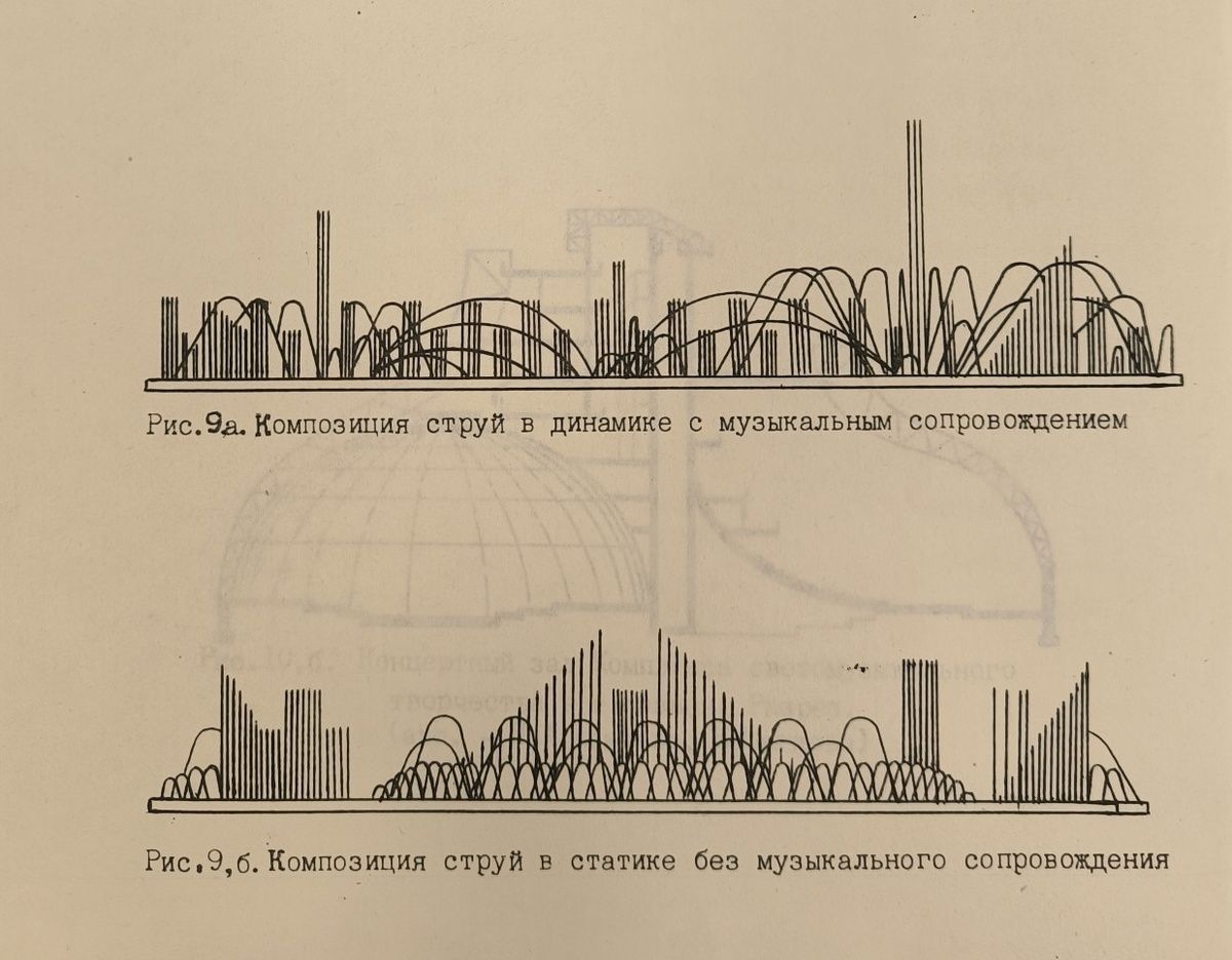 «Управление высотой струй, сменой цвета и яркости по проекту могло осуществляться как вручную, так и автоматически», - сообщает автор блога. На иллюстрации к проекту, который так и не состоялся, можно увидеть «композицию струй».