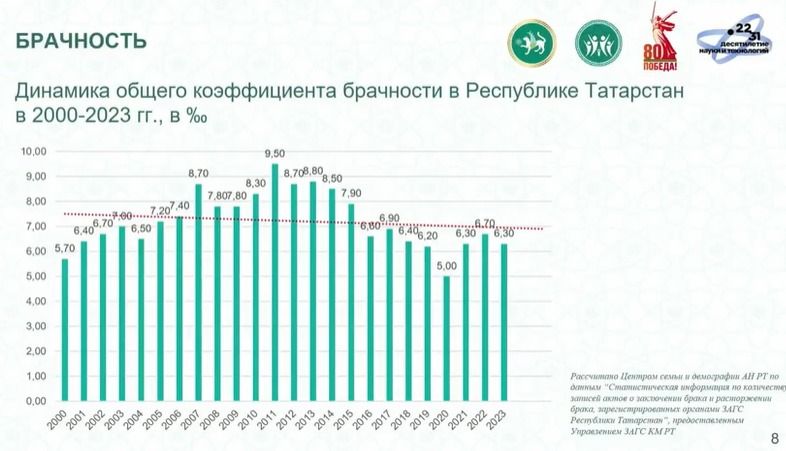 «Анализ за период с 2000 до 2023 года показывает устойчивую тенденцию к снижению процента брачности (отношение числа браков к среднегодовой численности населения, на 1000 человек - прим. ред.). Если в 2011 году этот показатель составлял 9,5 промилле, то в 2023 году он снизился до 6,3 промилле», - пояснила спикер.