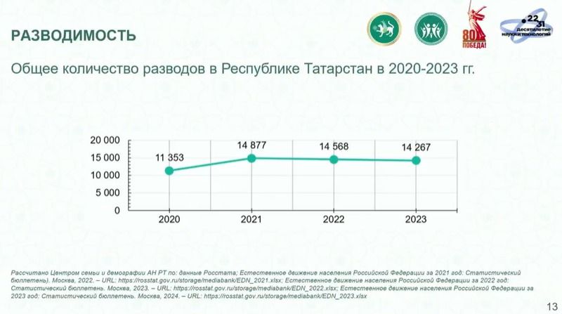 Ситуацию осложняют и разводы, которых в Татарстане ежегодно регистрируется более 14 тысяч. Резкий скачок произошел в пандемию - с 11 353 в 2020-м — до 14 877 в 2021-м. С тех пор он упал, но незначительно - до 14 267 в 2023-м.