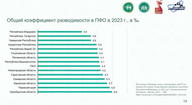 При этом в Татарстане один из самых низких коэффициентов разводимости в ПФО - 3,6 промилле по данным на 2023 год. К примеру, лидером по разводам в округе являлась Оренбургская область с показателем в 5 промилле. Средний возраст разводящихся мужчин в Татарстане - 36,1 года, у женщин - 35,2 года.