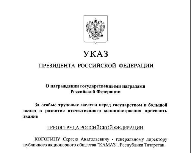 Президент России Владимир Путин подписал указ о присвоении генеральному директору ПАО «КАМАЗ» Сергею Когогину звания Героя труда. Соответствующая информация размещена на сайте компании.