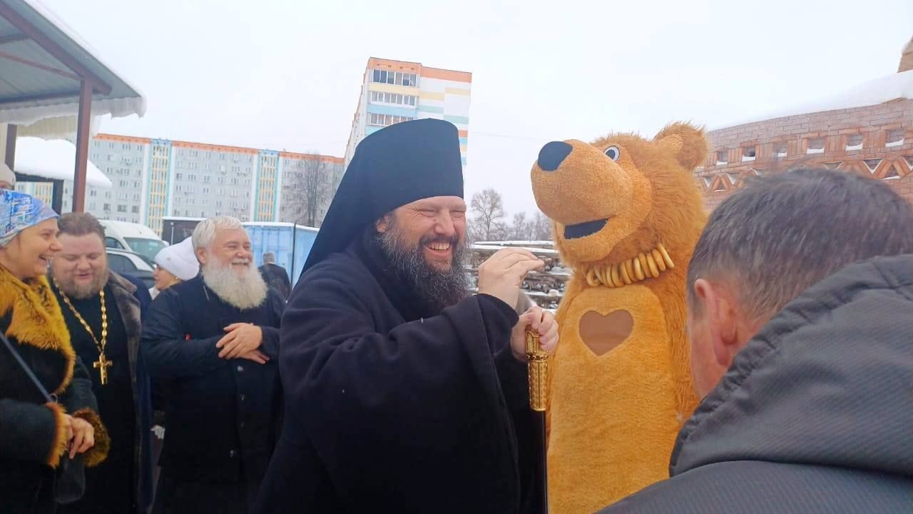 В храме Николая-чудотворца состоялся престольный праздник (праздник в память святого, во имя которого освящён храм – прим.ред.). После богослужения глава Набережночелнинской епархии, отец Гавриил увидел во дворе прихода ростовую куклу в виде медведя и угостил его баранками. Свидетели запечатлели веселые кадры.