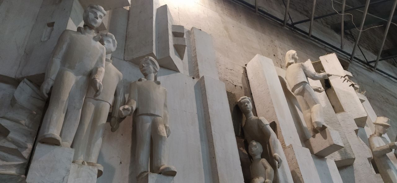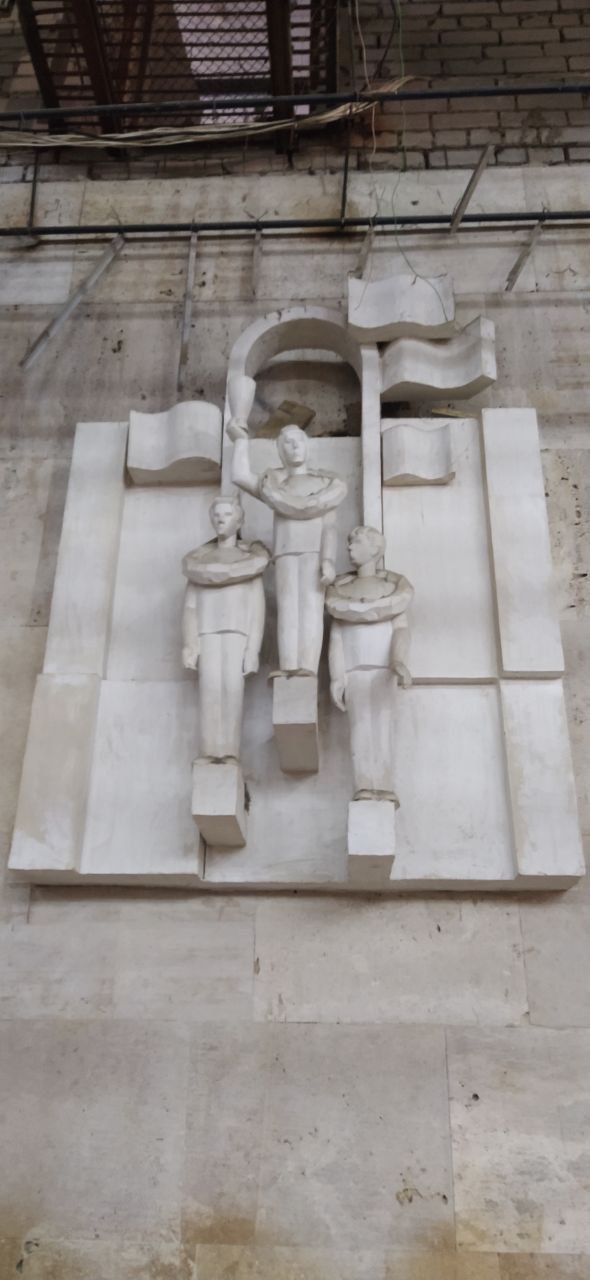 Строители помогли активистам снять горельефы. Они разные по размеру – полтора на три метра, полтора на полтора метра, конструкции сборные – состоят из частей. Большинство хорошо сохранились, у одной работы отсутствует фигура – это утеряно, у второй скульптуры отошла голова, можно восстановить.