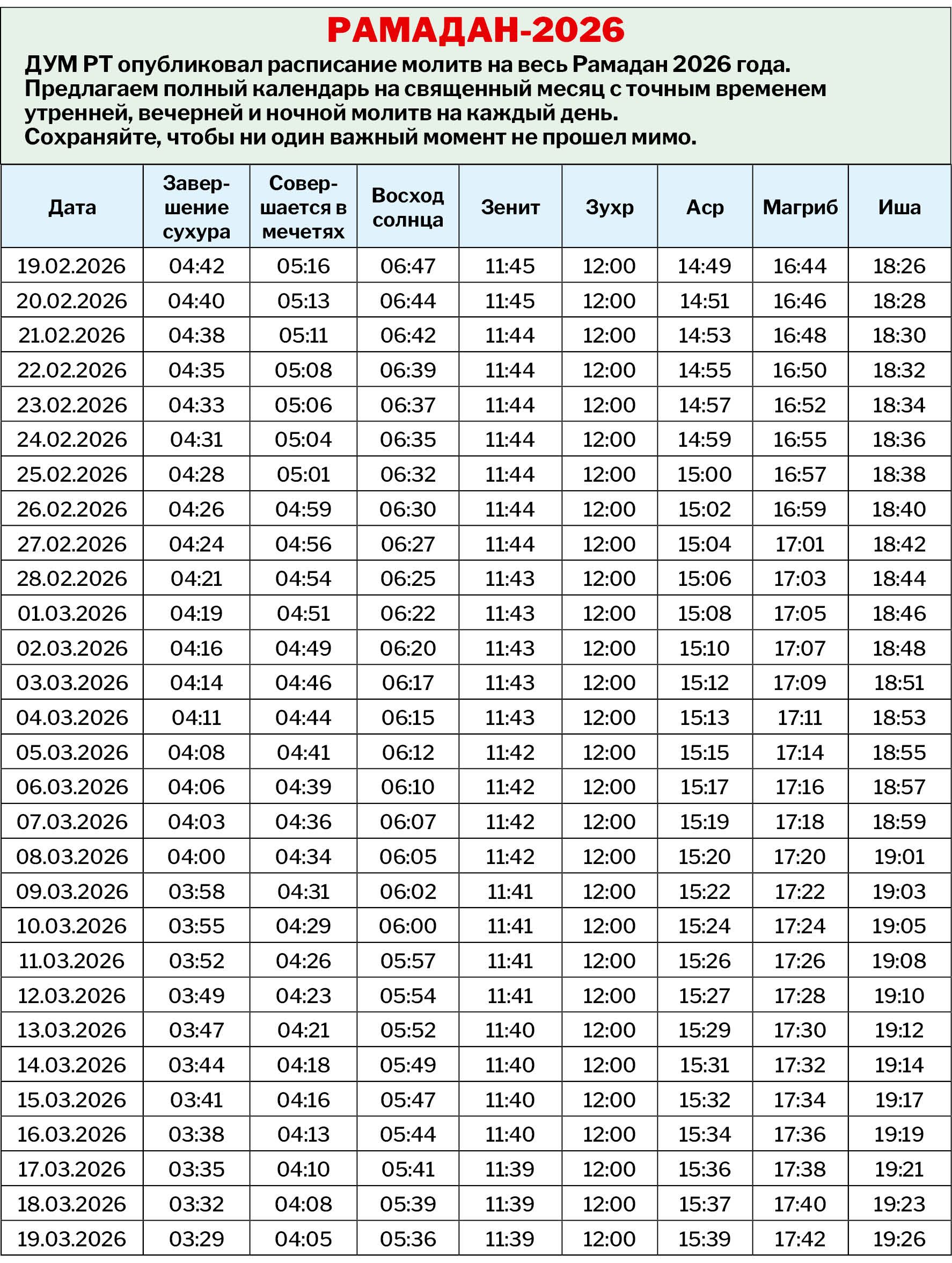 Календарь намазов в Рамадан-2026 дли жителей Татарстана