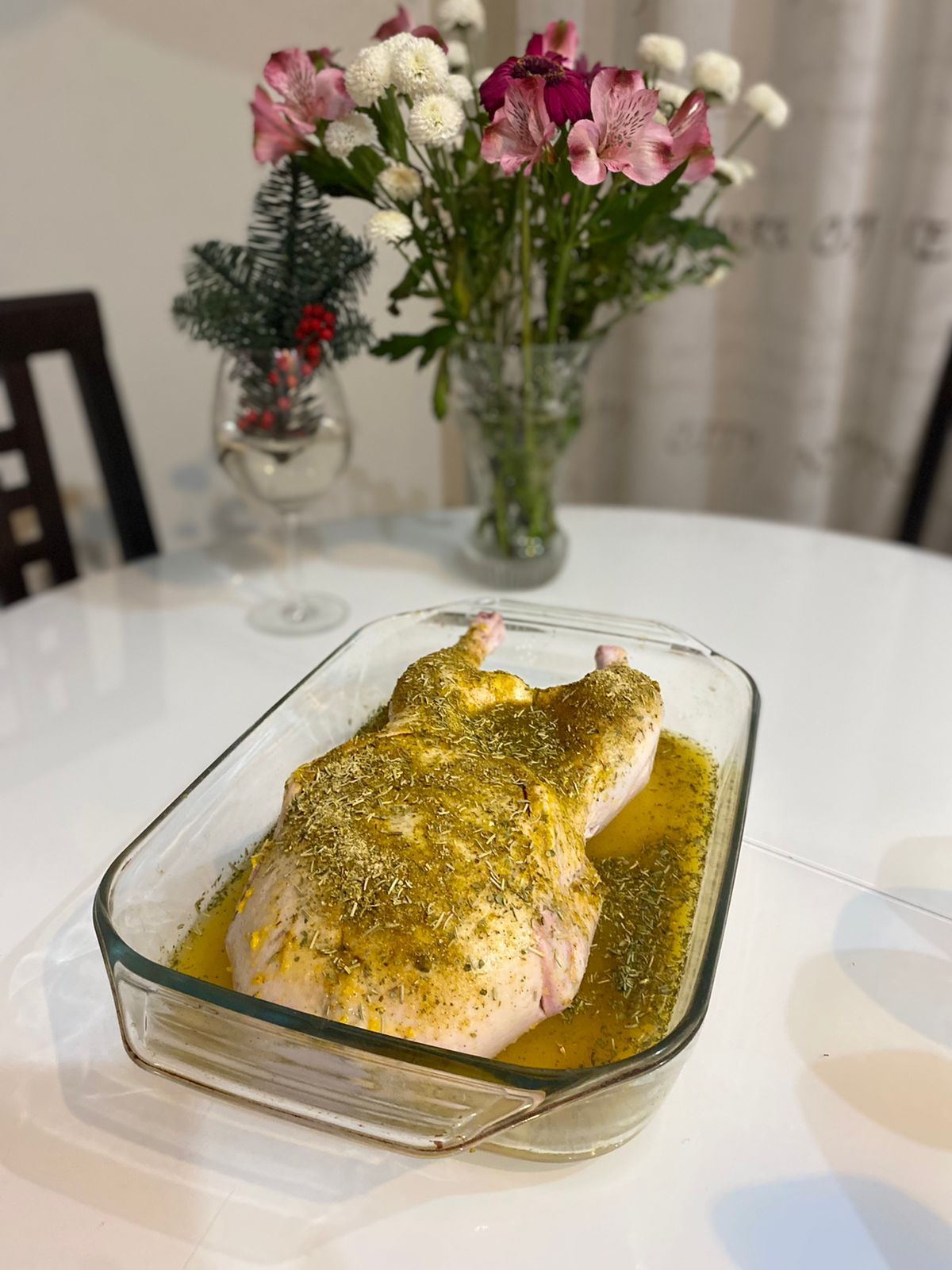 Смешать в миске 1,5 стакана апельсинового сока и цедру, добавить по 1 ч. л. соли, молотого имбиря, розмарина, куркумы и смеси перцев.