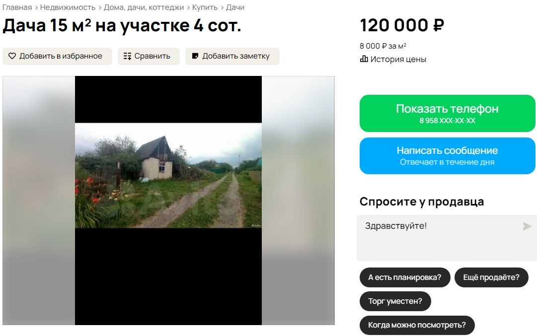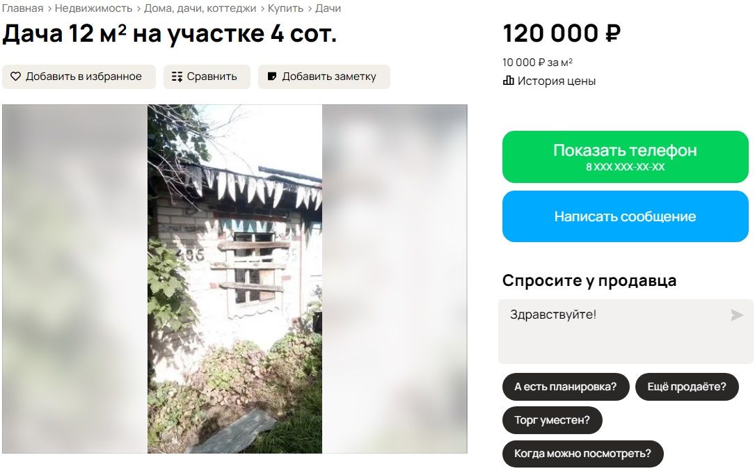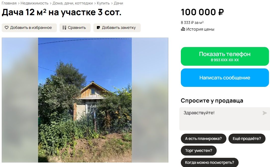 На втором месте располагается дом в СНТ «Черемушки». За 100 тысяч рублей продавец предлагает 3 сотки с однокомнатным одноэтажным домом в 12 кв. метров. Отмечается, что участок приватизирован. История цены подсказывает, что больше года назад участок обошелся бы в 150 тысяч рублей, однако с момента публикации цена падала еще трижды, постепенно зафиксировавшись на нынешней отметке.