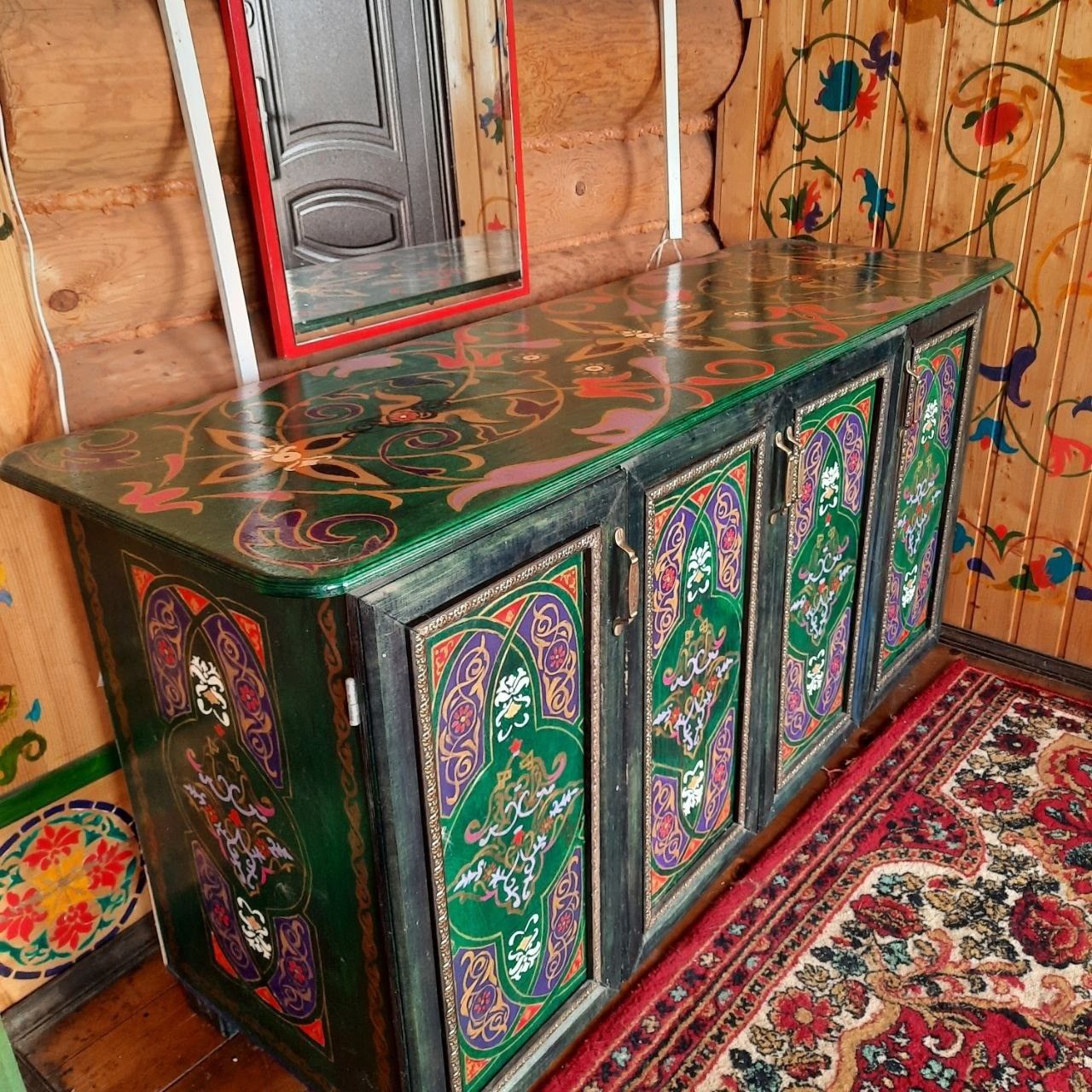 Хозяйке хотелось, чтобы в дышащем свежестью бревенчатом теремке и мебель была особая, уж точно не из ДСП. Муж показал себя мастером на все руки- сделал тумбочку, потом комод, буфет, кровать и кухонный гарнитур. Ларисе все понравилось и она загорелась оживить интерьер: купила кисточки и краски, основы посмотрела в интернете, сама фантазировала. Появился кураж, и энергичная выдумщица украсила узорами не только мебель, но и стены, двери, крыльцо, ворота дома, потом и дровяную баню преобразила. Красивая женщина с ямочками на щеках разбирается, какие дрова для нее лучше: конечно, березовые. Научилась вязать веники, которые здесь впервые и увидела.