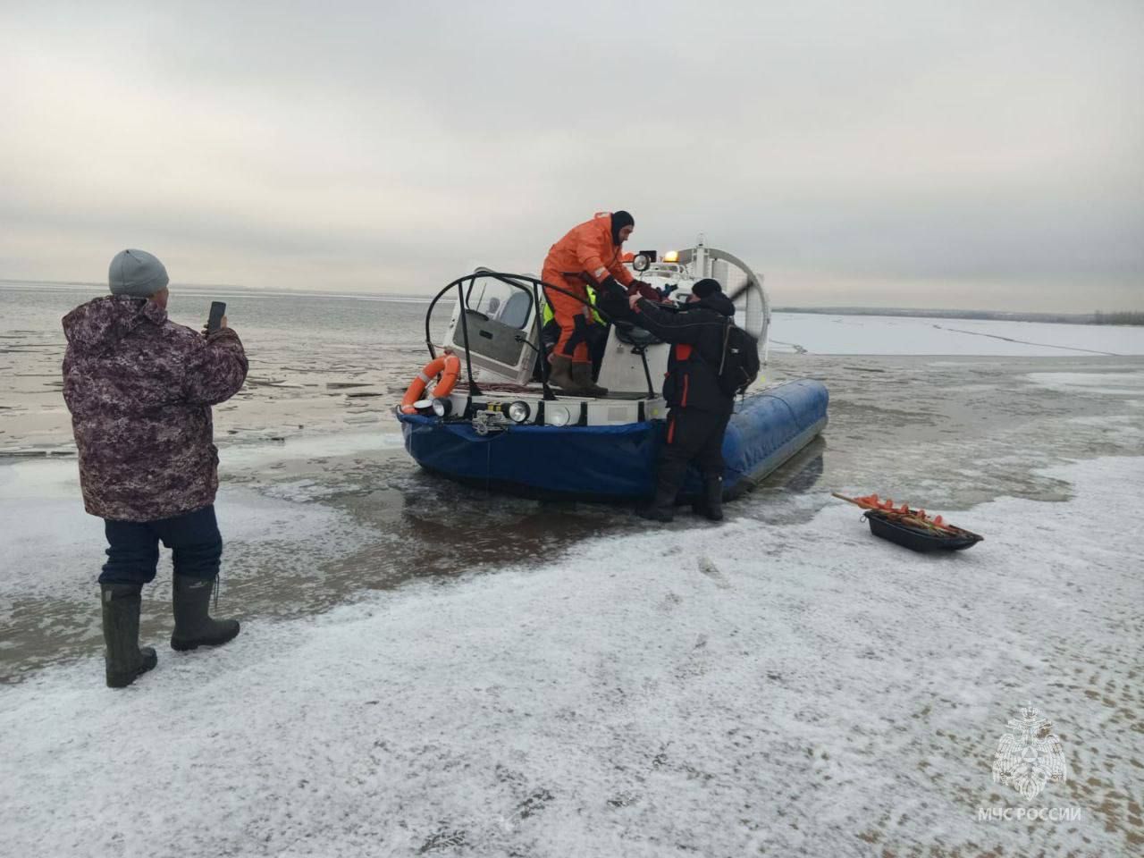 На помощь выезжали спасатели на судне с воздушной подушкой. К счастью, они успели вовремя - медпомощь рыбакам не понадобилась.