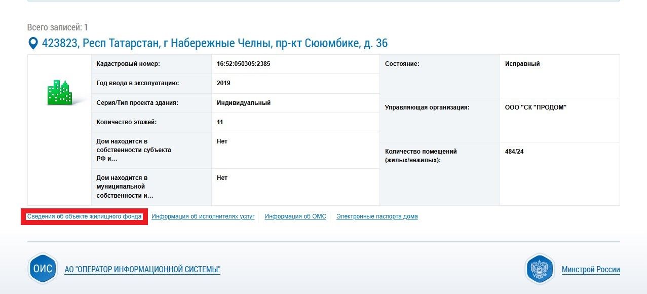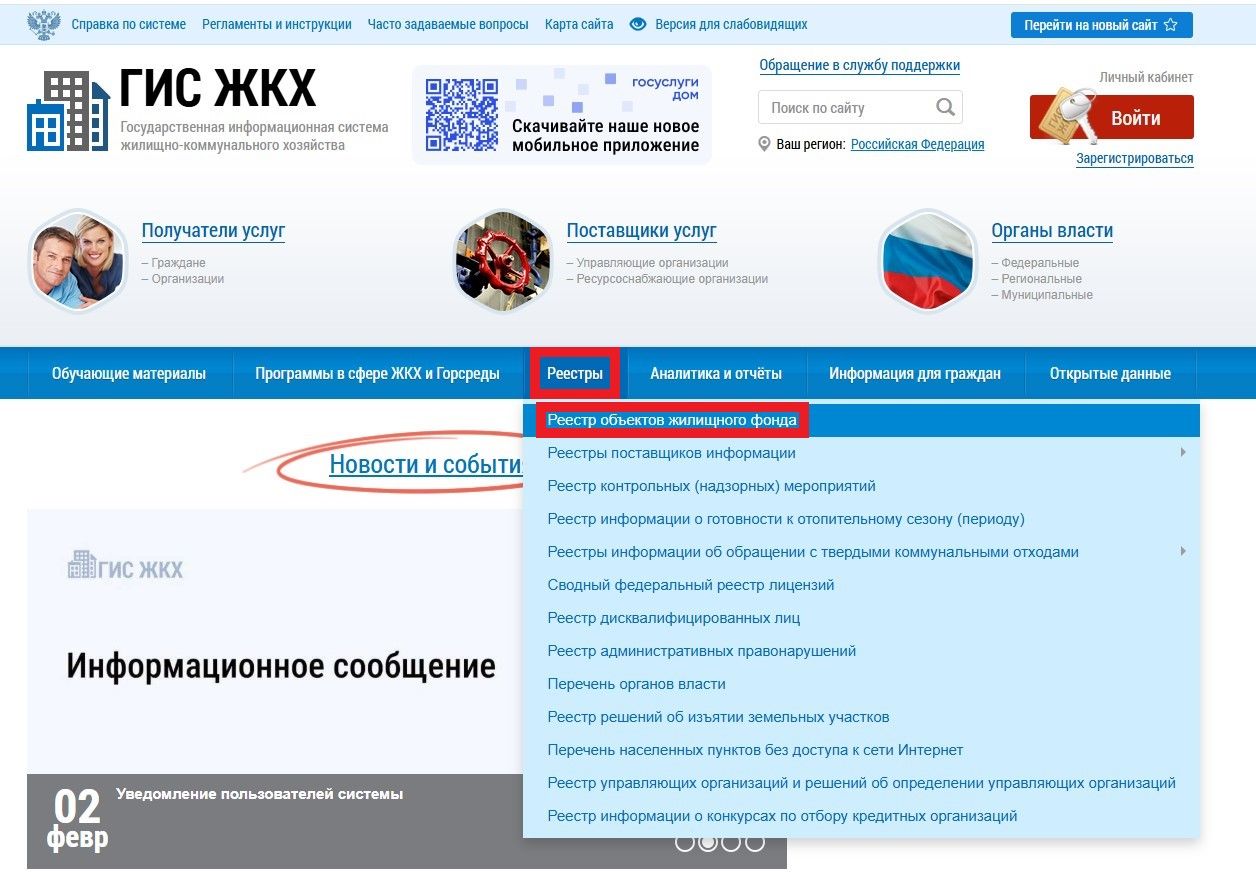 На главной странице ГИС ЖКХ перейти в раздел «Реестры», где выбрать подраздел «Реестр объектов жилищного фонда».