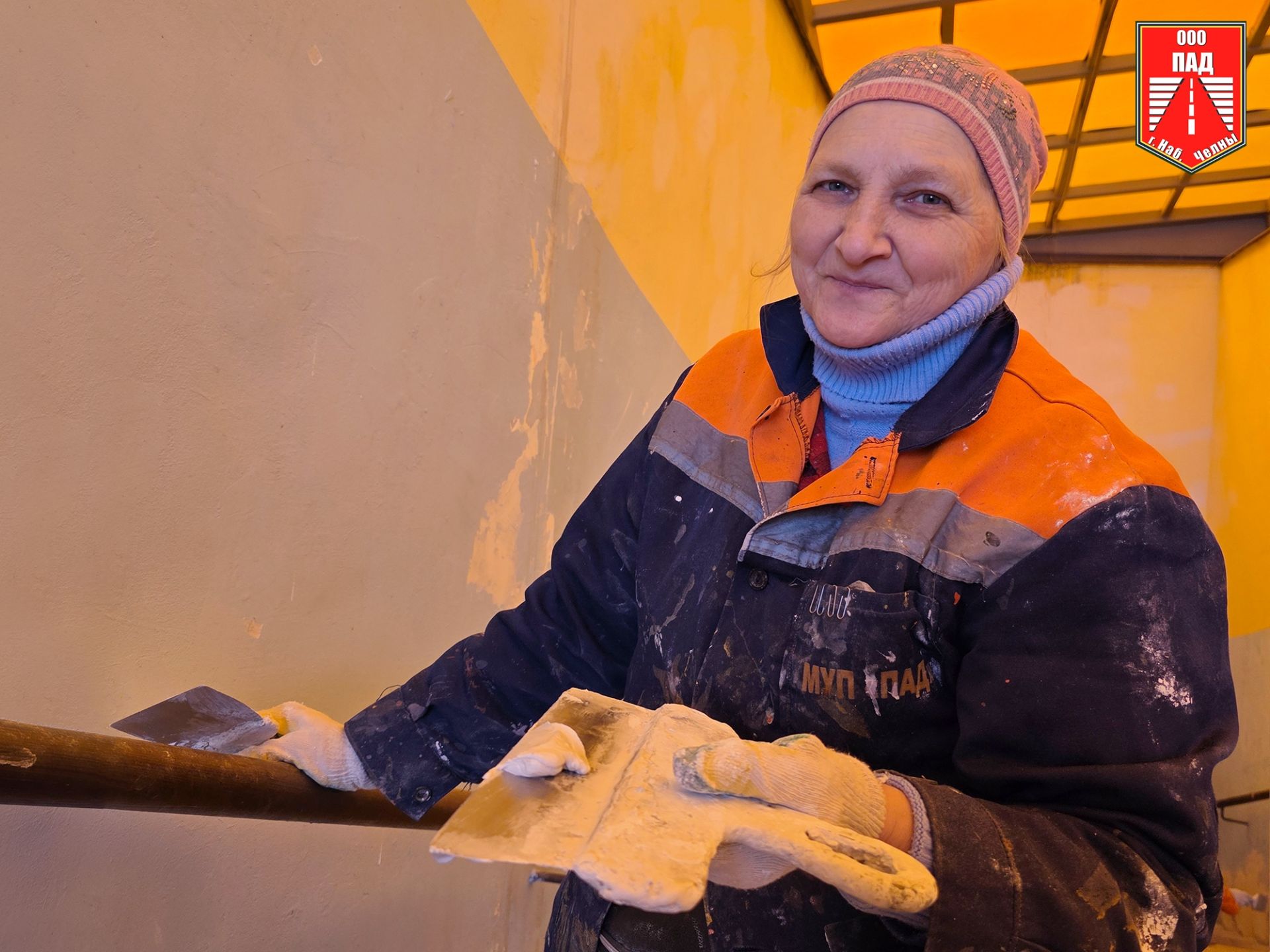 Маляр Елена Смелкова подробно описала технологический процесс: стены сначала очищают, затем оштукатуривают, наносят два слоя шпатлёвки, после чего шлифуют, грунтуют и, наконец, красят в два слоя. Из-за уличного холода шпатлёвка сохнет значительно дольше. Некоторые уже обработанные участки до сих пор остаются сырыми – необходимо дождаться их полного высыхания.
