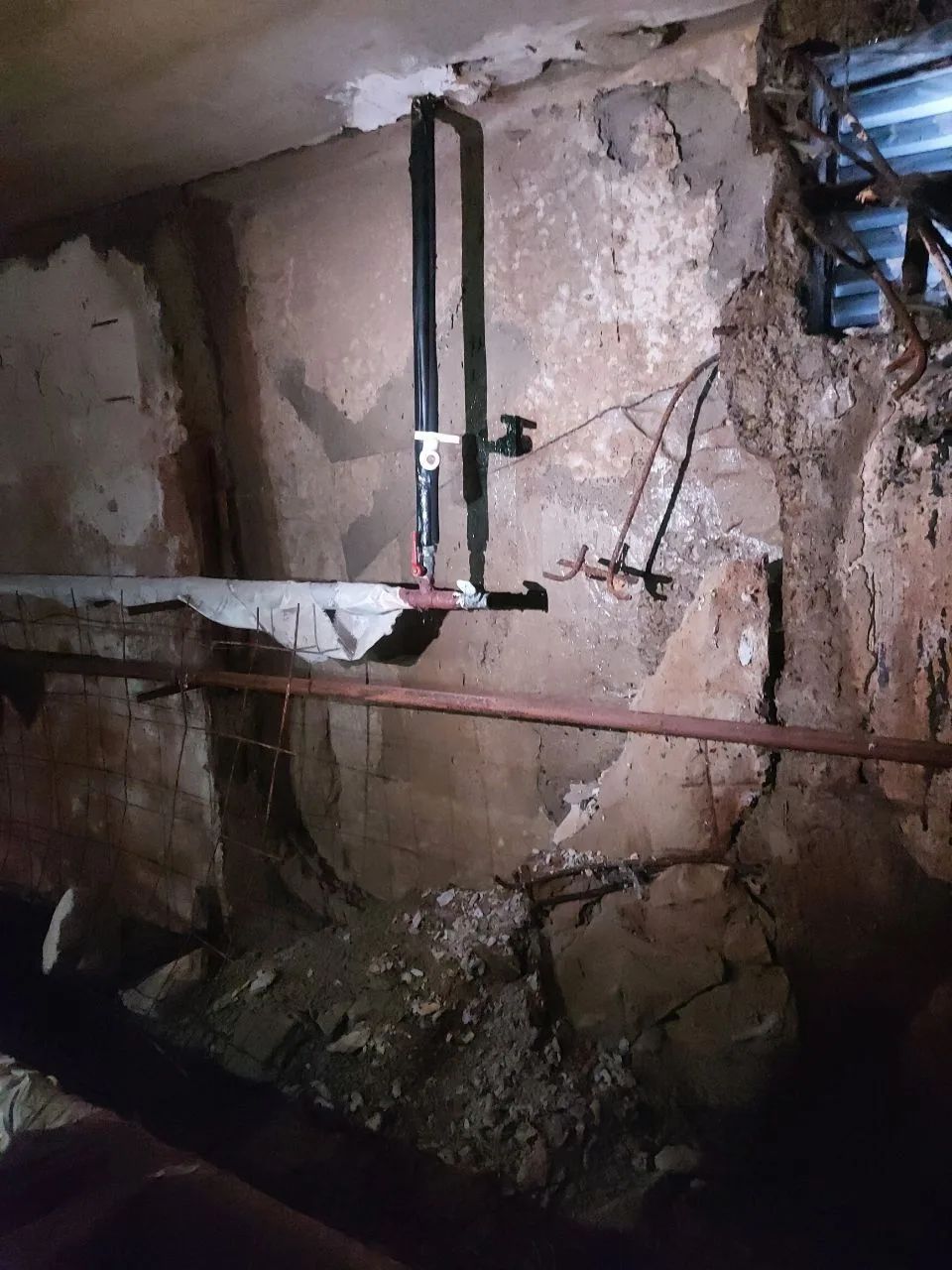 Инспекторы в доме 42/10 обнаружили более 10 нарушений. Есть неисправные инженерные сети, в том числе отопления. В подвале нарушена теплоизоляция труб отопления и горячего водоснабжения, имеются следы затопления канализацией – влажный грунт, конденсат на стенах и сетях, закрыты продухи, осыпается штукатурка со стен, оголилась арматура.
